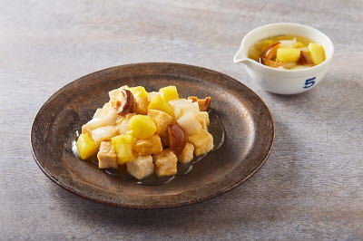 With a mild taste and a soft texture, bean curd is a popular Korean food ingredient. Sliced bean curd, minced meat and vegetables, including mushrooms, water parsley, crown daisy are boiled in a large pot. This hot pot is a popular menu item for winter.