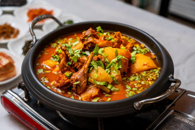 Ground potato is mixed with starch, poured and fried on a lightly oiled frying pan. Chives, carrots, and mushrooms can be added depending on preference. With a mild taste and a chewy texture, potato pancakes are a popular side dish with alcoholic drinks or snacks. Dip the pancake in soy sauce with onions to add flavor.