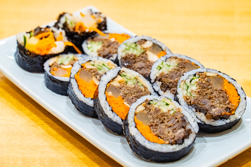 Glass noodles and chopped onions, carrots, and green onions are wrapped in laver and deep-fried. These crispy and savory laver rolls are a popular snack among youths. They commonly enjoy these laver rolls with stir-fried rice – they either dip the rolls in the spicy sauce or mix the rolls with stir-fried rice. You can easily find deep-fried laver roll at street food stalls or snack shops.