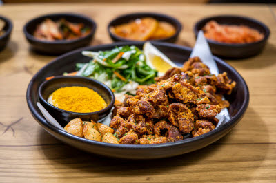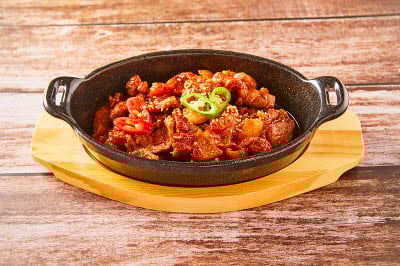 Vegetables or seafood are usually thinly sliced, coated with flour, and then coated with an egg mixture, and finally pan-fried in an oiled pan. The dish is made with beef, codfish fillet, oysters, zucchinis, green peppers, mushrooms, and green onions and several of these pan-fried battered ingredients are served together on a plate. The dish is frequently ordered as a side dish for alcoholic beverages.