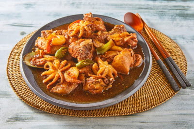 The small abalone hot pot, featuring blue abalones, blue crab, clam, and shrimp, has a light soy paste–based broth as well as spicy and refreshing seafood flavors. The blue abalone, a type of ear shell, is more elastic than regular abalone and has a uniquely chewy texture.
