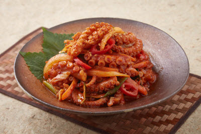 Pork small intestine is stir-fried with spicy seasoning and various vegetables, such as cabbage and onion. Depending on the restaurant’s recipe, rice cake, glass noodles, or blood sausage can be added. The chewy and savory pork tripe and spicy seasoning result in an unbelievable balance of flavors.