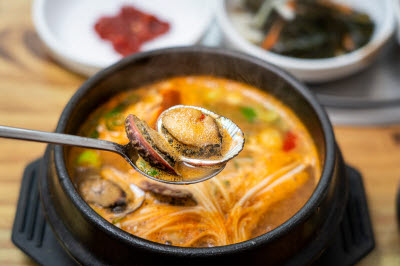 This plump, large prawn is called daeha. Steamed prawn, frequently enjoyed in the royal courts, was a precious dish served with pine nut sauce and a wide array of toppings. With this combination of prawns and sauce, the deep flavors of the savory and light meat shine.