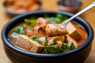 Pollack has several names depending on the region, cooking method, drying method, and size. Any raw fish is called “myeongtae,” and when dried, it is called “bugeo.” When frozen, it is called “dongtae.” If it is dried out throughout the winter to be a shade of yellow, it is called “hwangtae.” If the young pollack is dried, it is called “nogari,” or dried young pollack; if the pollack is half-dried, it is called “kodari,” or half-dried pollack; and if it dries into a black hue while making hwangtae, it is called “meoktae.” Meoktae was cheaper than hwangtae, so it was used as a side dish for the common people. Selling it as a simple snack that was good to go with a beer (from a local corner store) in Jeonju, it quickly grew in popularity across the country. If you grill it well on briquettes, the savory taste is excellent.