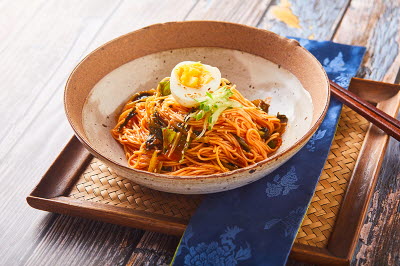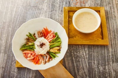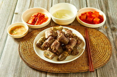 This dish is made with thinly sliced black goat meat, mixed with ginseng powder and sauce, then grilled with vegetables. Black goat meat is rich in protein and is warm in temperament, which, according to traditional Korean medicine, makes it ideal for those with weak temperaments and women. The meat is also tender and has only half amount of fat as beef, making it ideal for patients suffering from stomach disorders. Black goat meat is first marinated in sweet pear juice, then mixed with a sauce made from soy sauce, sugar, green onions, garlic, ginger, and sesame oil before being grilled. When clad in the scent of fire, this bulgogi offers a perfect side dish that is tender and rich.