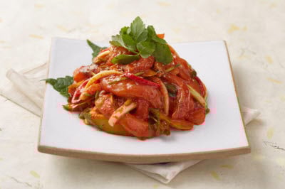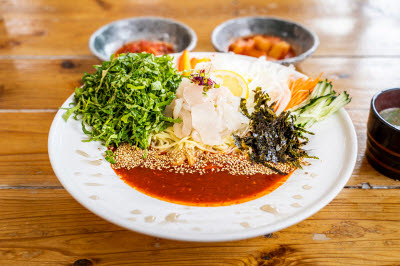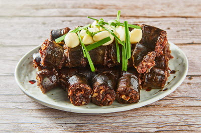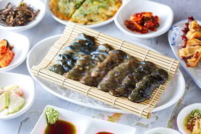 This is a folk dish often eaten in Busan alongside fishcake skewers at snack stands around the city. It is a rice cake stick, skewered as one would with fish cake, simmered in a fishcake soup. Rice cake sticks used for this dish are thin and long, made from steamed nonglutinous rice powder. When simmered in warm broth, they soften and become tender, yet chewy. It soaks up the fishcake soup and brims with light yet savory flavor. The skewers are dipped in soy sauce to taste, but some places use red chili paste with vinegar. However, true aficionados like their skewers without any extra sauce.
