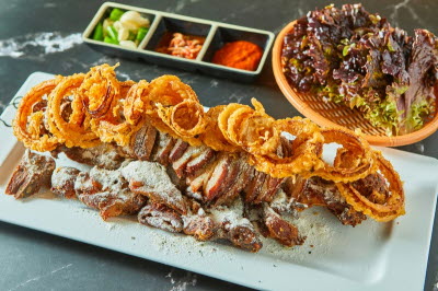 Bulgogi is a favorite beef dish among many Koreans. Bulgogi with rice is the best way to enjoy delicious bulgogi as a meal, without having to prepare rice and side dishes separately. Marinate thin slices of beef and onion in soy sauce, sugar, sesame oil, garlic, and sesame salt, and fry them in a frying pan. Put rice in a bowl and add the well-cooked bulgogi and seasoned green onions to complete it.