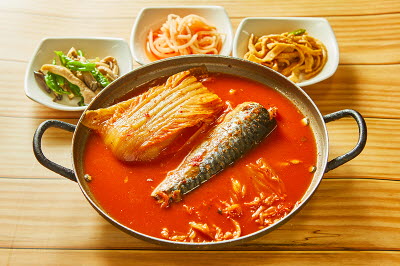 Thistle is a specialty of Jeongseon, Gangwon State. Indeed, various dishes using thistles are found in the region. This dish is made by placing thistle in a pot, topping it with mackerel, adding a sauce made with chili pepper powder, soy sauce, and garlic, and boiling the mixture with a broth made with medicinal herbs. Thistle’s fragrance helps to take away mackerel’s fishy odor, leaving it tender. Thistle is said to help lower blood sugar levels, aid in digestion, and protect the liver. It goes very well with Omega-3 fatty acid-rich mackerel in both nutrition and flavor.