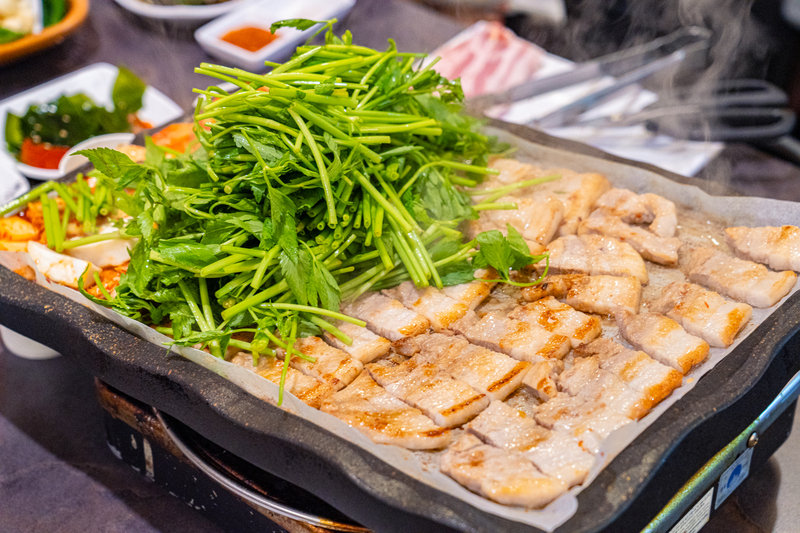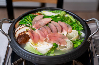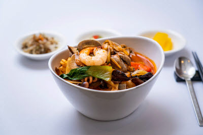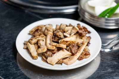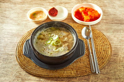 This soup is made by making a meatball with minced chicken, salt, and black pepper. Meatballs are formed with minced chicken, starch powder and egg whites and flavored with minced garlic, salt, and black pepper. The meatballs are cooked in boiling soup, and beaten eggs and sesame oil are added to the soup at the very end. Putting chives and red chili pepper improves the color of the dish. Its rich and clear soup, coupled with tender meatballs, is substantial enough for a meal.