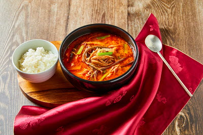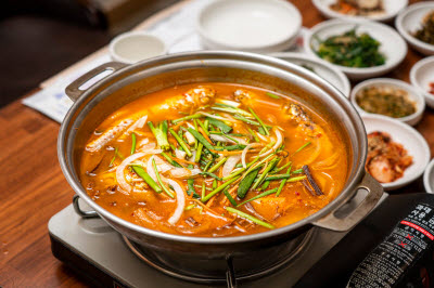 Spicy seafood and soft bean curd jjigae is made with soft bean curd and various seafood. It combines the characteristics of spicy seafood noodle soup and soft bean curd jjigae. Clams, squid, shrimp, and vegetables are added, then simmered in a spicy broth with red chili powder. The addition of soft, savory bean curd brings together a rich spiciness with a smooth texture. While spicy seafood noodles usually refer to a noodle dish, spicy seafood and soft bean curd jjigae is often enjoyed with warm rice.
