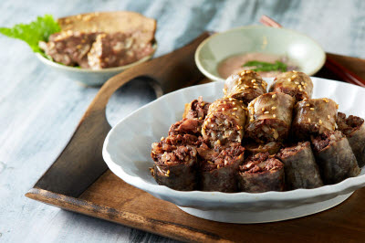 Sliced raw plaice is a dish of thinly sliced raw plaice. The flesh is firm with a tight grain, offering a slightly chewy texture and a subtle sweet flavor. It is often served with the skin on to enhance texture, or as bone-in slices. The dish is typically dipped in a sauce made of red chili paste, vinegar, and sugar, or soy sauce-based dipping sauces.