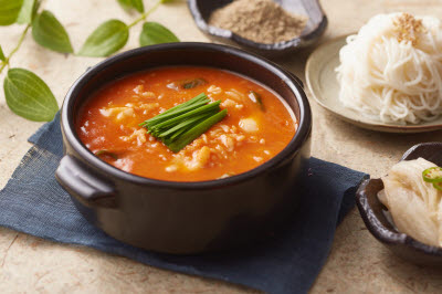 Ray is a flat-bodied fish with wide fins, commonly enjoyed in Korea either as a salad or steamed dish. Sliced raw ray salad is made by mixing boiled ray flesh with a red chili paste-based sauce. The flesh is chewy and resilient, complementing the bold, spicy, and tangy flavors of the sauce. Vegetables such as radish, cucumber, and water dropwort stems are often added, and the dish is frequently served chilled.
